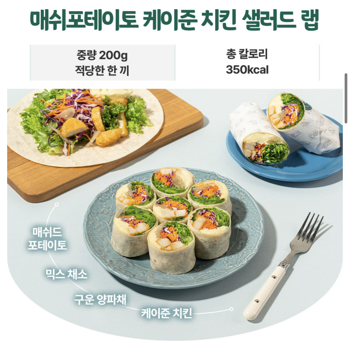 | 매쉬 포테이토 케이준치킨 샐러드 랩 | 200g | 350kcal | 드레싱 없음 |