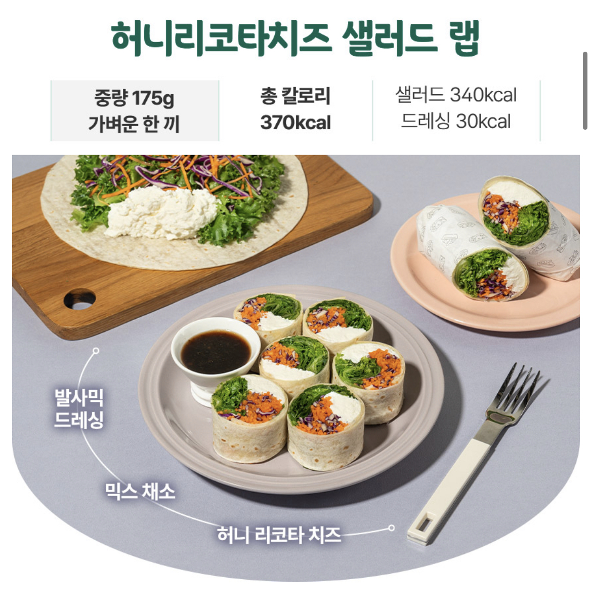 | 허니리코타치즈 샐러드 랩 | 175g | 370kcal | 30kcal |