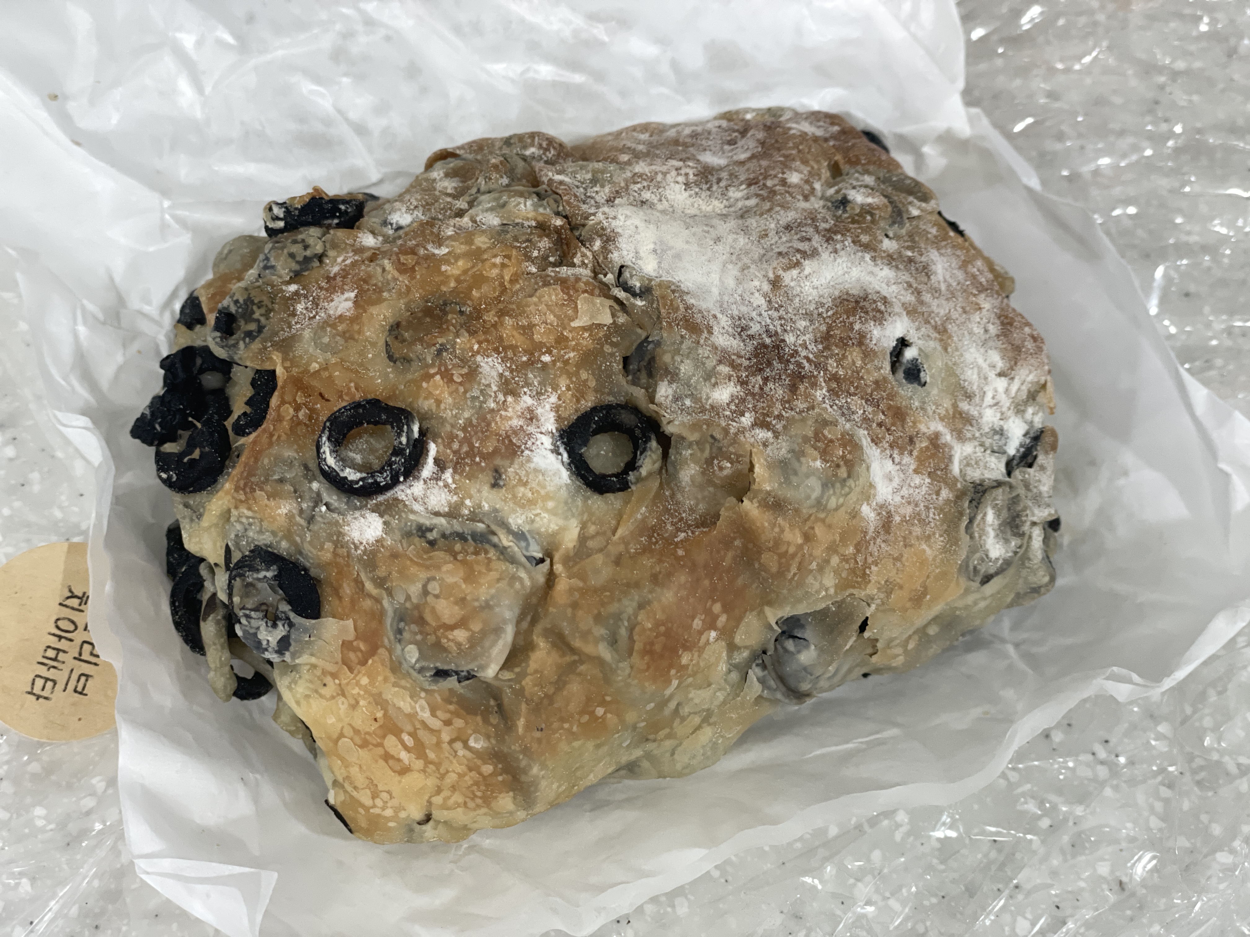 내용물이 너무 많아서 빵 반죽이 눌렸거나 혹은 제대로 익지못하고 올리브와 함께 뭉쳐져 떡이된 듯한 부분이 있긴 했습니다.