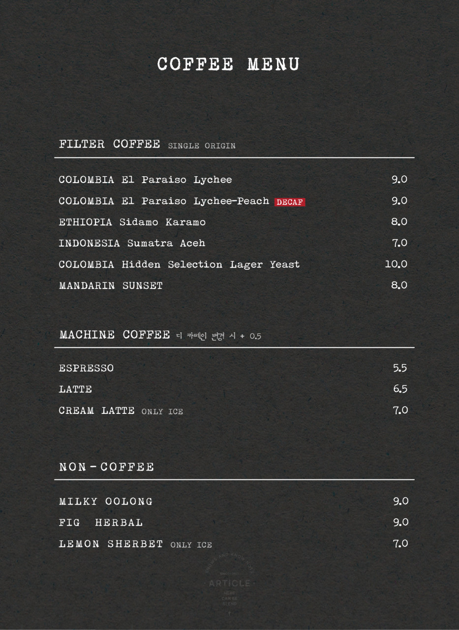 아티클 서촌, 광화문, 종각역사, 선릉역사, 뚝섬... 신기하게 다른 지점들은 필터커피를 팔지 않는데 서촌지점만 판매하고 있는 듯 해요.