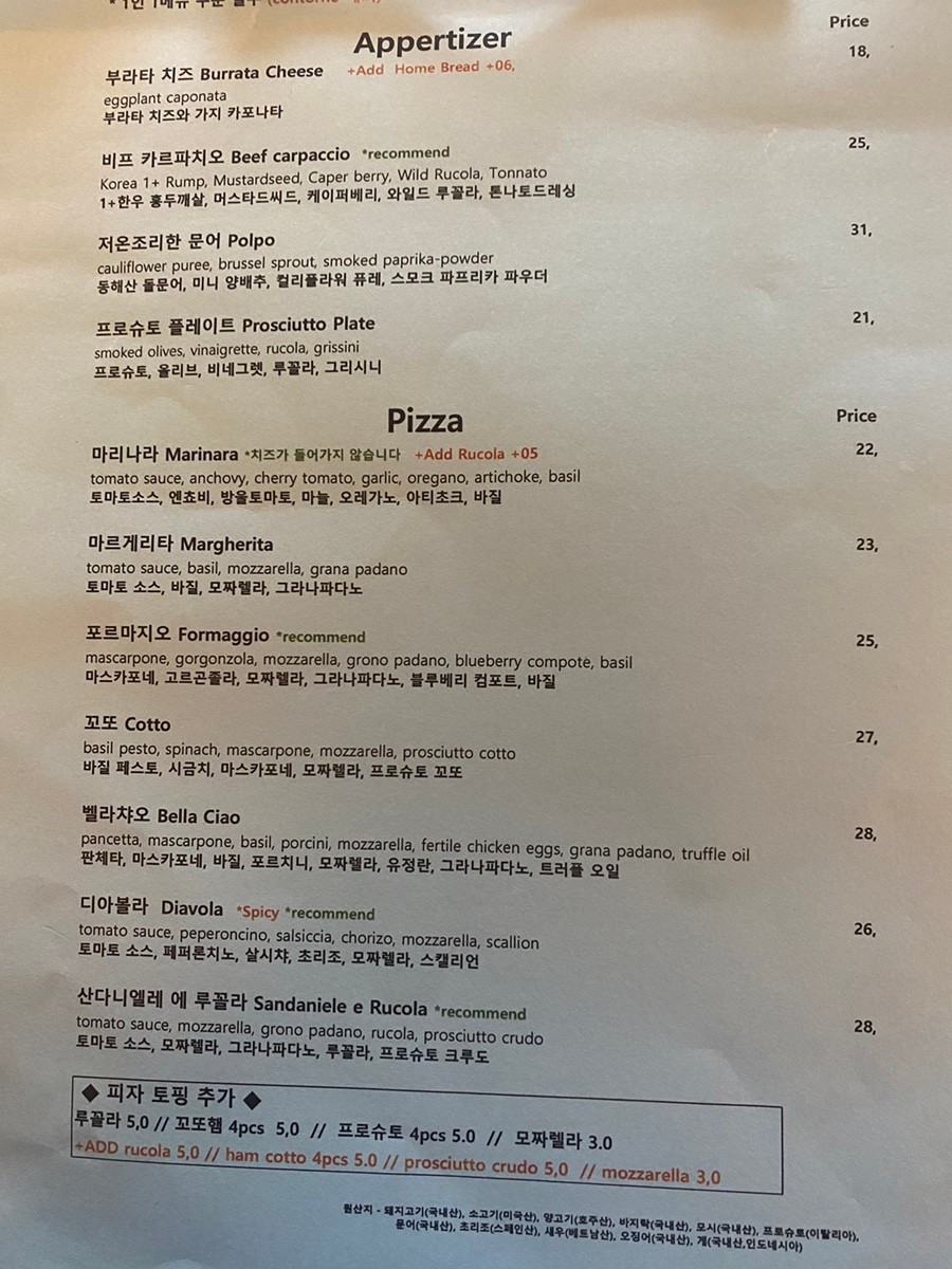 보통 화덕피자집은 이렇게 추가할 수 있는 옵션이 있는 집이 별로 없는데 피자에 토핑을 따로 추가할 수 있는 점이 좋았습니다. 다음에는 마리나라에 루꼴라를 가득 추가해서 먹어보고 싶네요.